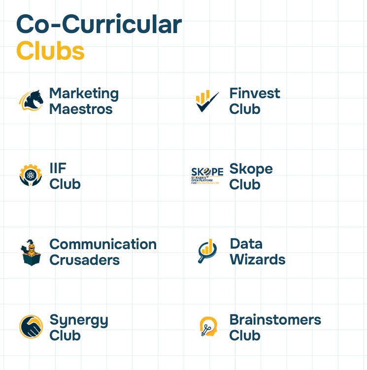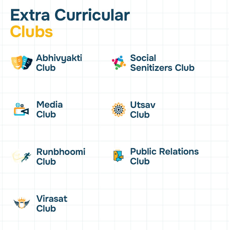 Students have access to a range of co-curricular and extracurricular clubs, such as Utsav Club, Marketing Maestros, RunBhoomi Club, and many more.