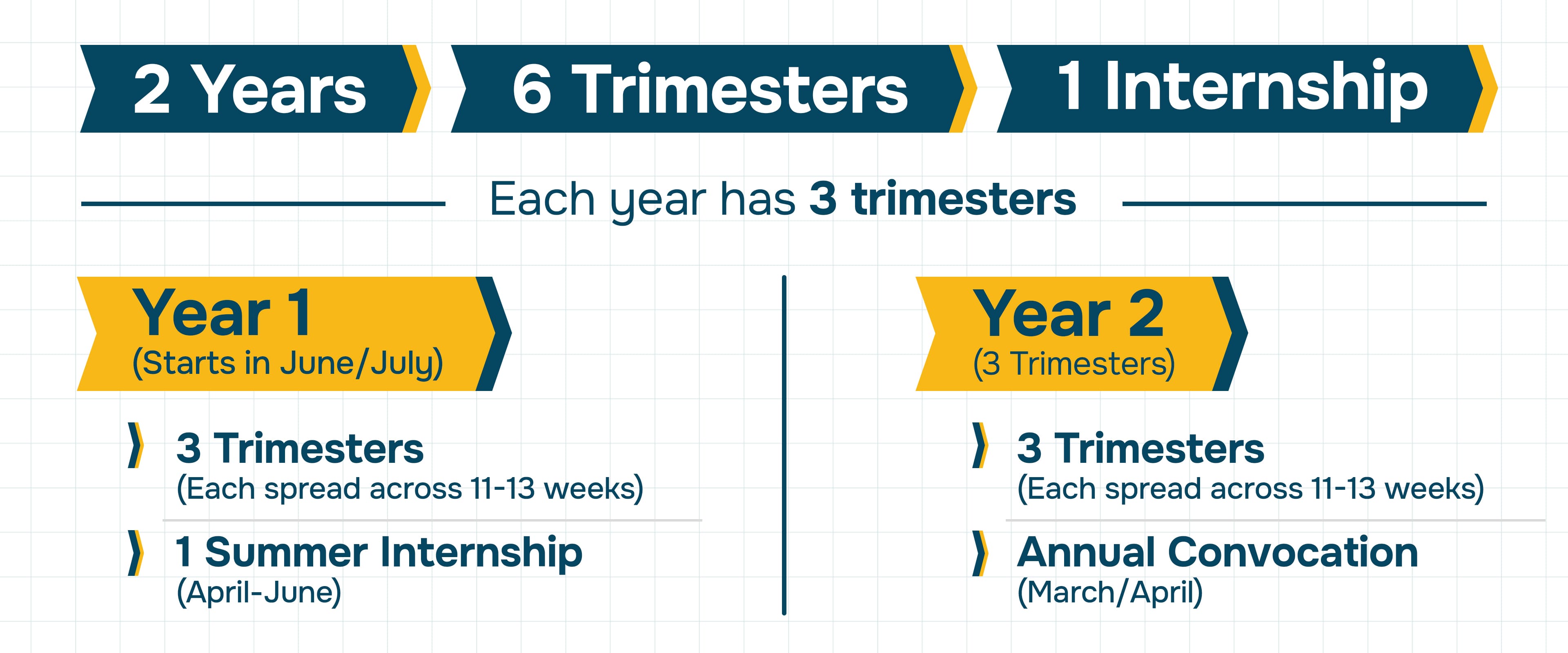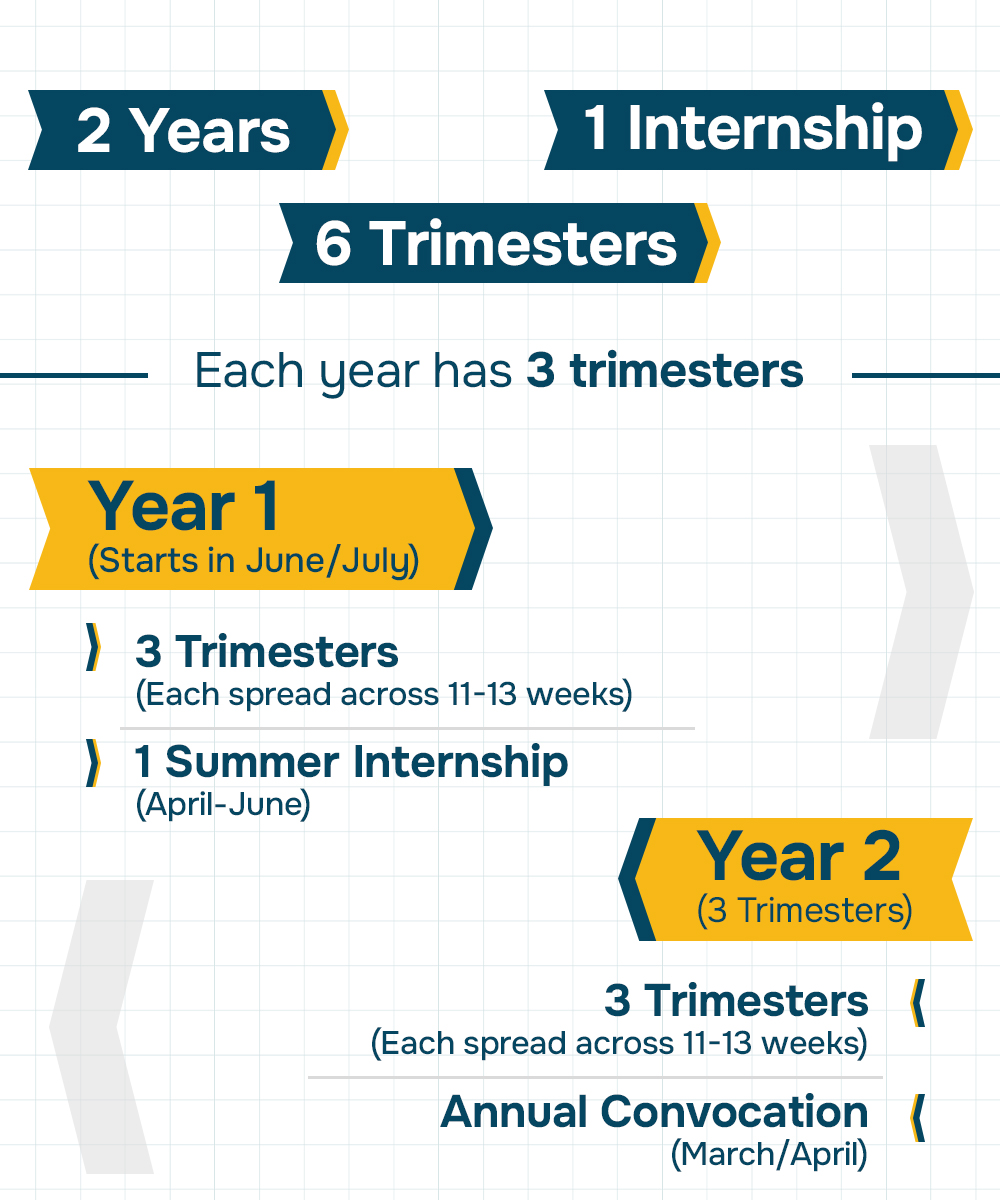 The course is divided into 2 years. The first year has 3 trimesters with general management. The second year has 3 trimesters that focus on specializations chosen by the student. Overall, academics are given 42% of learning hours and skill development is given 58% of learning hours in two years.